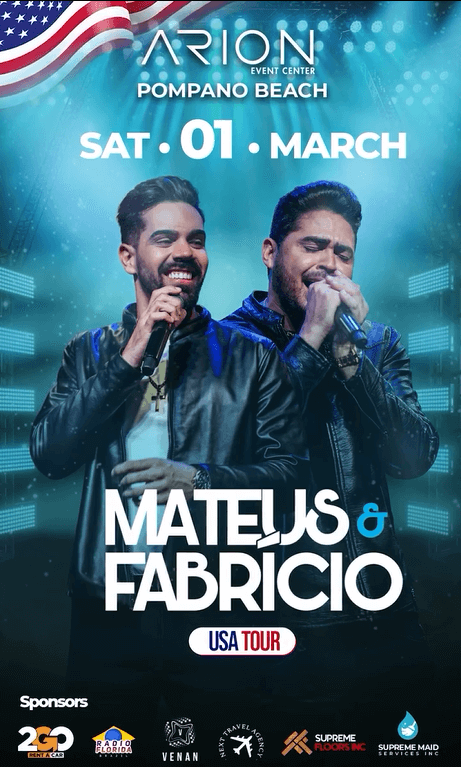 Prepare-se para uma noite épica! No dia 01 de março de 2025, Mateus e Fabricio estará se apresentando no Arion Eventos, em Pompano Beach! Venha se divertir com um show recheado de músicas contagiantes e performances que vão fazer você dançar a noite toda. Mateus e Fabricio conhecidos por sua energia única e carisma no palco, promete uma experiência inesquecível!